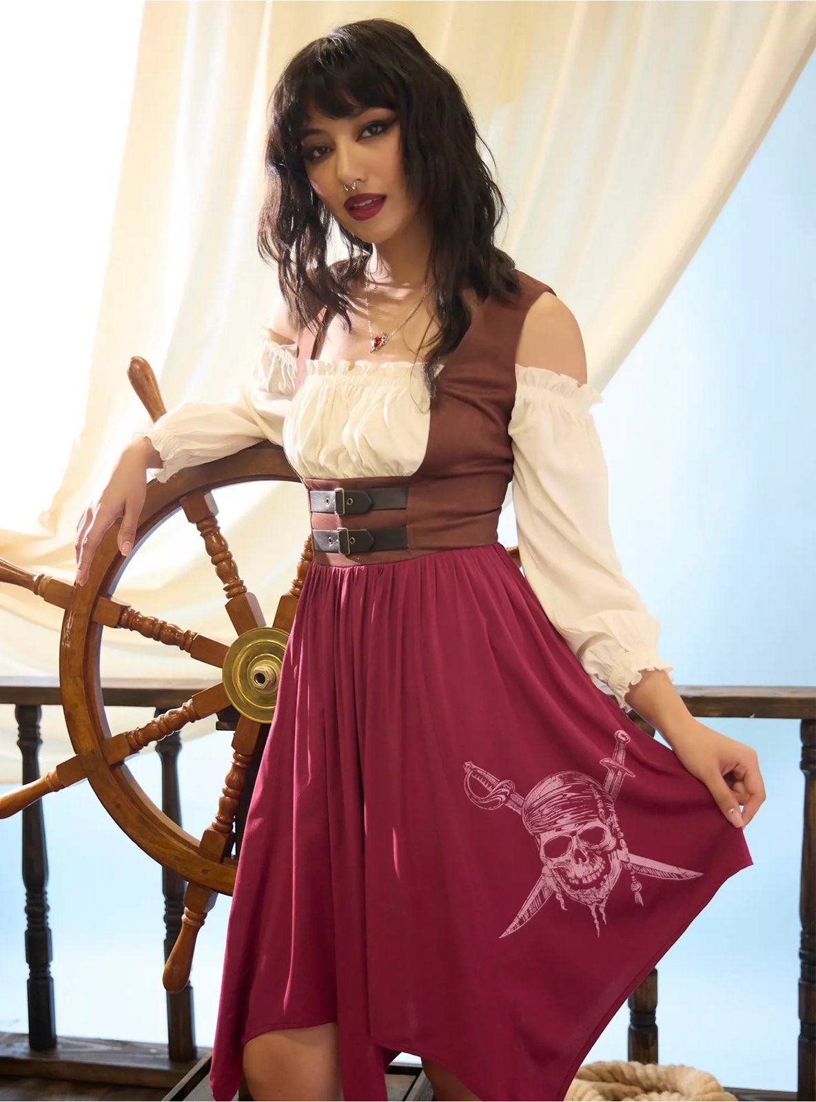 Avast! Don’t let this dress be claimed by Davy Jones’ locker! Set sail for a swashbuckling adventure in this Pirates of the Caribbean dress! Featuring a brown faux suede bodice with buckle detailing and cream cold shoulder long-sleeves with ruffle trim. Designed with a hanky hem skirt printed with the film's skull and crossed swords logo. Comes with a back zipper closure and side seam pockets to hold yer plunder.