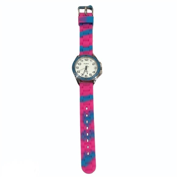Sophie watch. Hot pink & blue silicone/rubber watchband. Watchface is white w silver numbers. The bezel is shiny silver w blue top & silver numbers. Watch has never been used. The original protective cover is on the face, back and buckle. watch face is 1.25: diameter. End to end is 8.25" and 5.5" to smallest hole. Band is 5/8" wide. Like new condition. Needs battery. Very rare find!! NWOT