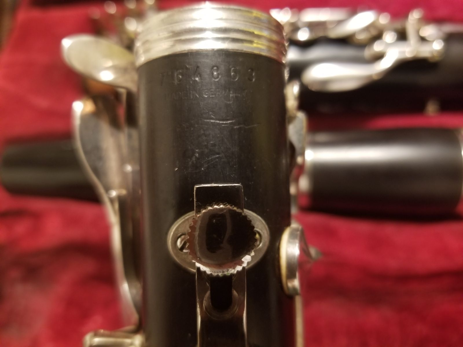 Accent wood clarinet made in Germany. This clarinet is the same as a Buffet E11 Clarinet just marked Accent. The clarinet is in good shape plays good pads seal only thing I see is a crack on the bell starting to develop .