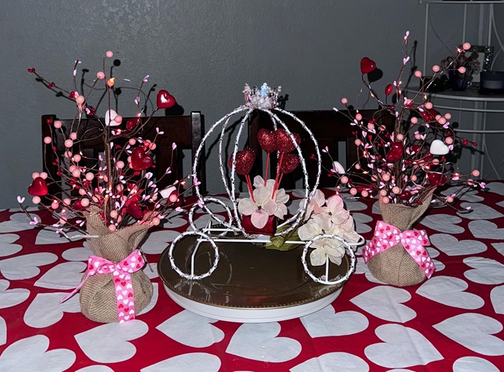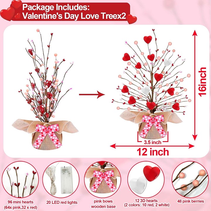 2 Pack Lighted Valentine's Day Tabletop Tree Decorations:The set includes 2 Pack tabletop lighted trees, each measuring 16 inch(H)*12 inch(W). and a 3.5 inch pink bows wooden base, the trees can stand stably